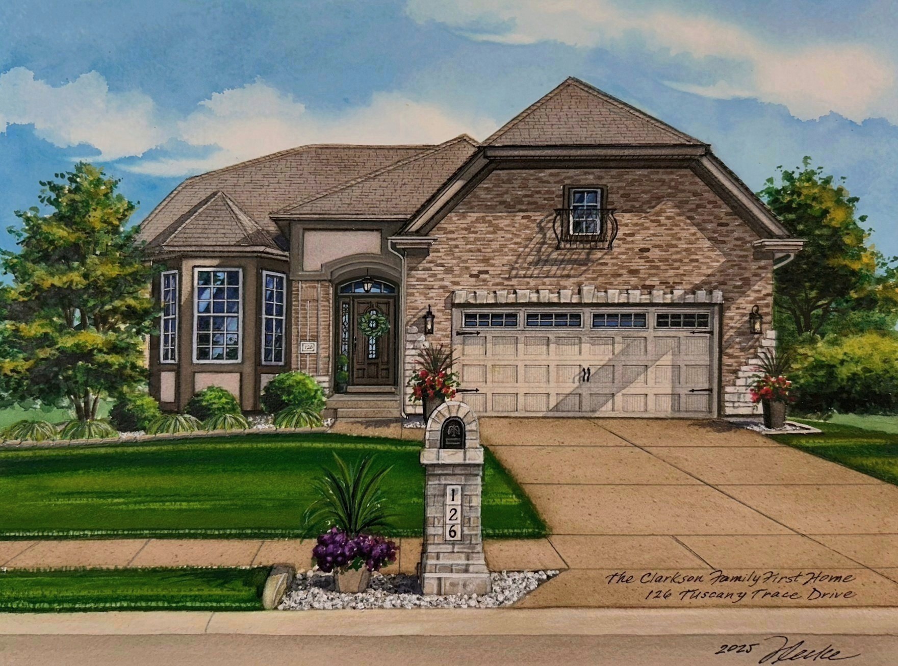 This 9″ x 12″ watercolor portrait depicts a family’s first home and the great character it possesses. The attractive front door, multi-toned neutral bricks and stonework trim on this handsome home was interesting to render as was the mailbox. The artwork will be a gift from my clients to their son and daughter-in-law and I hope they will be pleased!