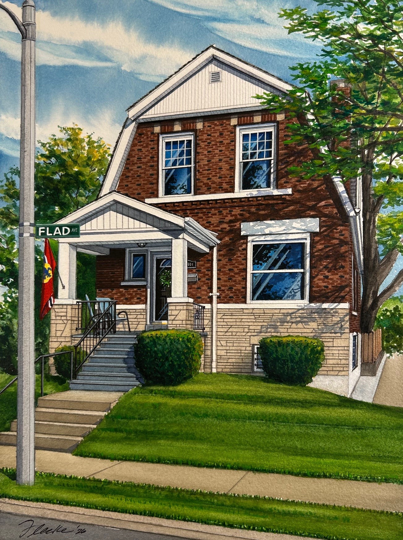 This first custom house portrait of 2026 depicts a large, older home in Saint Louis, Missouri with lots of great character. The 9″ x 12″ watercolor was commissioned by my client as a Christmas holiday gift to his wife — a very thoughtful thing to do! The artwork shows the intricate patterns of the brickwork and limestone exterior and was so interesting to depict! The portrayal of the lamp post with street sign, flag of Saint Louis, and two patio chairs on the front porch will be parts of their fond memories living in this home.