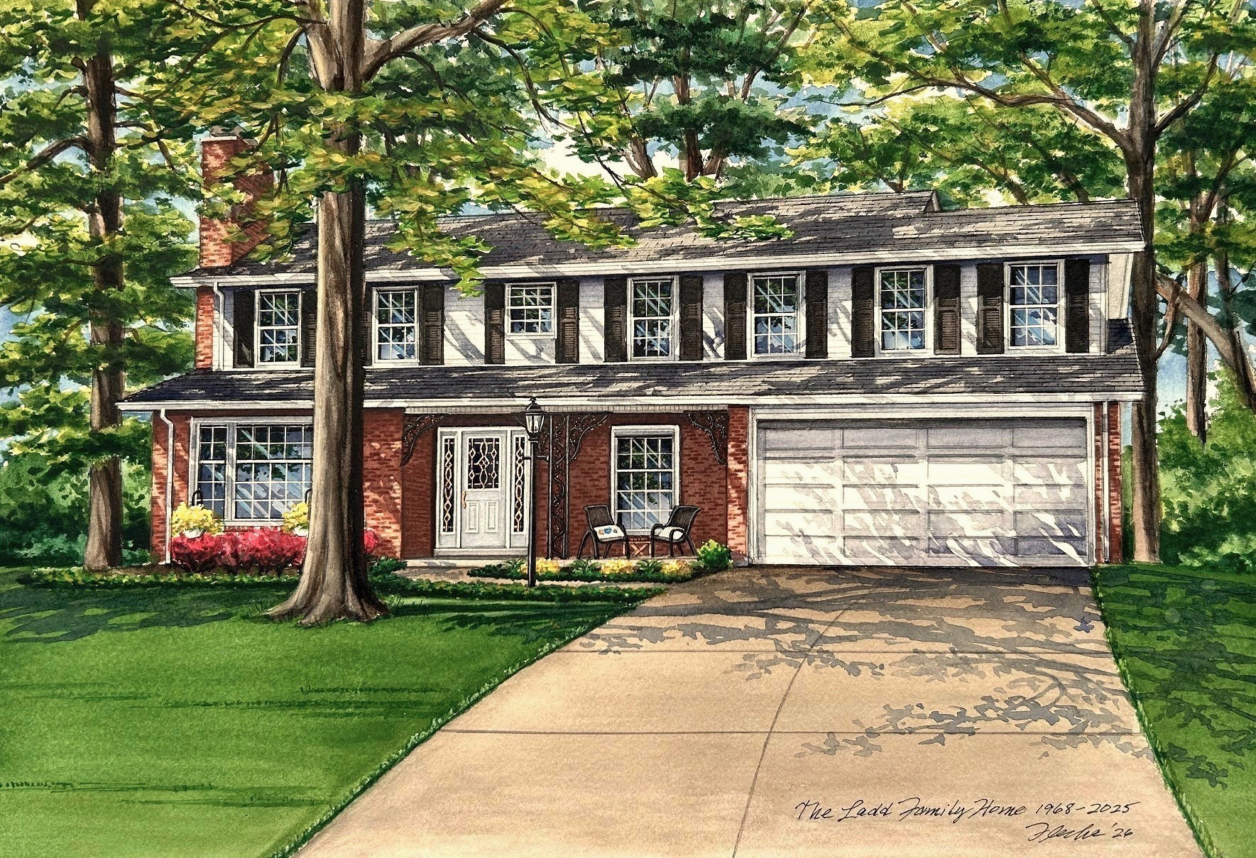 This 11″ x 16″ watercolor of a family’s beloved home in Saint Louis, Missouri was an honor to provide. The artwork depicts the residence of the grandparents of my client’s wife who recently sold this home after living there for FIFTY years. My client knew how much this home was loved, and commissioned this portrait as a gift for them. Five decades is a long time and so many events and memories were made there. I expect Kleenex will come in handy when the grandparents see their custom house portrait for the first time. Best wishes to them!