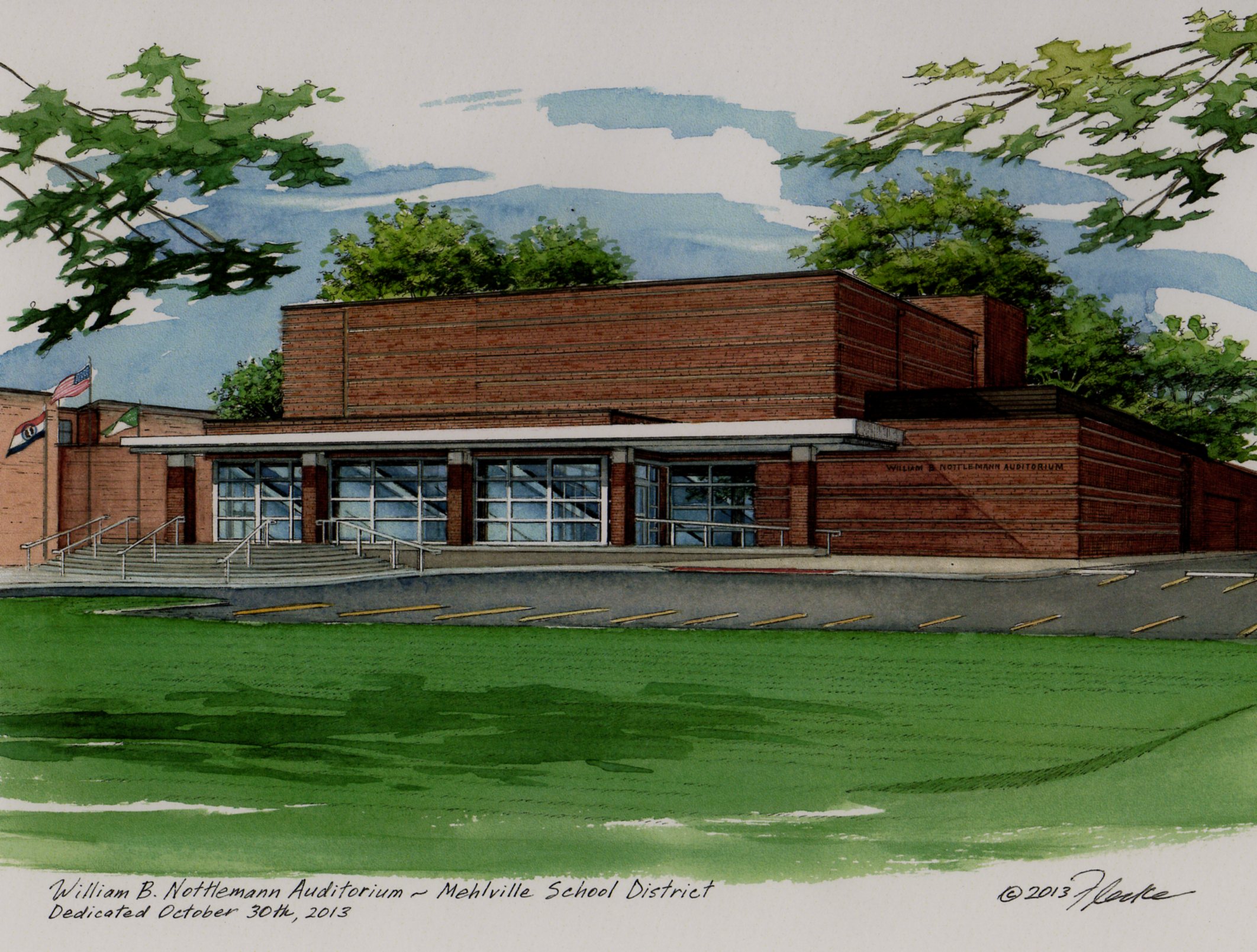 Just completed on December 8th…. a Pen & Ink with Watercolor overlay illustration of the newly constructed William B. Nottelmann Auditorium located on the campus of Mehlville High School in St. Louis, Missouri. This illustration was commissioned to be a gift for the school district Superintendent, who was instrumental in the creation of this state-of-the-art auditorium for use by the school children and local community. Many wonderful and memorable performances are sure to be ahead!