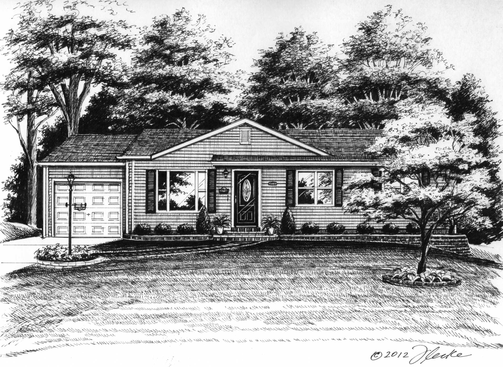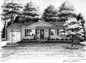 Just completed on January 13th ….. a Pen & Ink rendering of a frame ranch style home with a very generous front yard. The owners had recently done several nice exterior updates, and wanted a portrait to commemorate the new look to display next to an older rendering showing the original appearance. The mature trees in the rear of the property made a really nice visual backdrop to accentuate the home!
