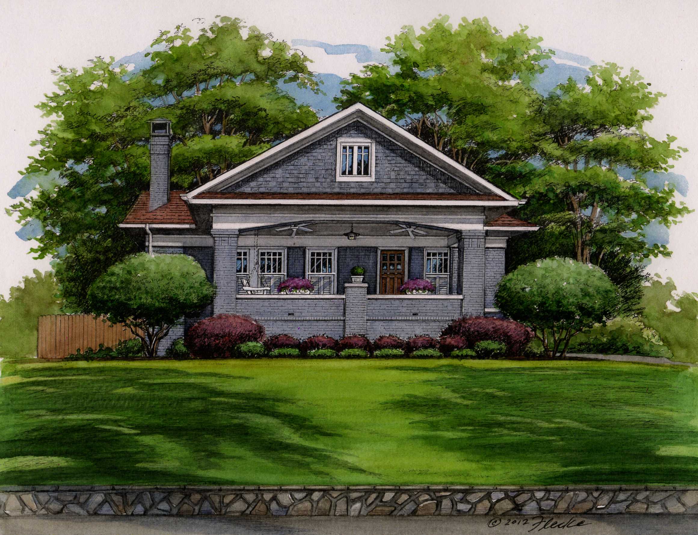 Just completed…. a Pen & Ink with Watercolor portrait of a tasteful residence in Atlanta. It was commissioned by a family member as a gift to the owners that lived there for many years. The artwork shows the manicured landscaping, and extra fullness was added to the trees and shrubs in the back of the home which made a nice backdrop to set off the gray color of the painted brick. The artwork features the white wooden porch swing and fans… sure to remind the owners of many enjoyable times spent together on the front porch, and the stone wall at the sidewalk is a nice touch for the ample front yard.