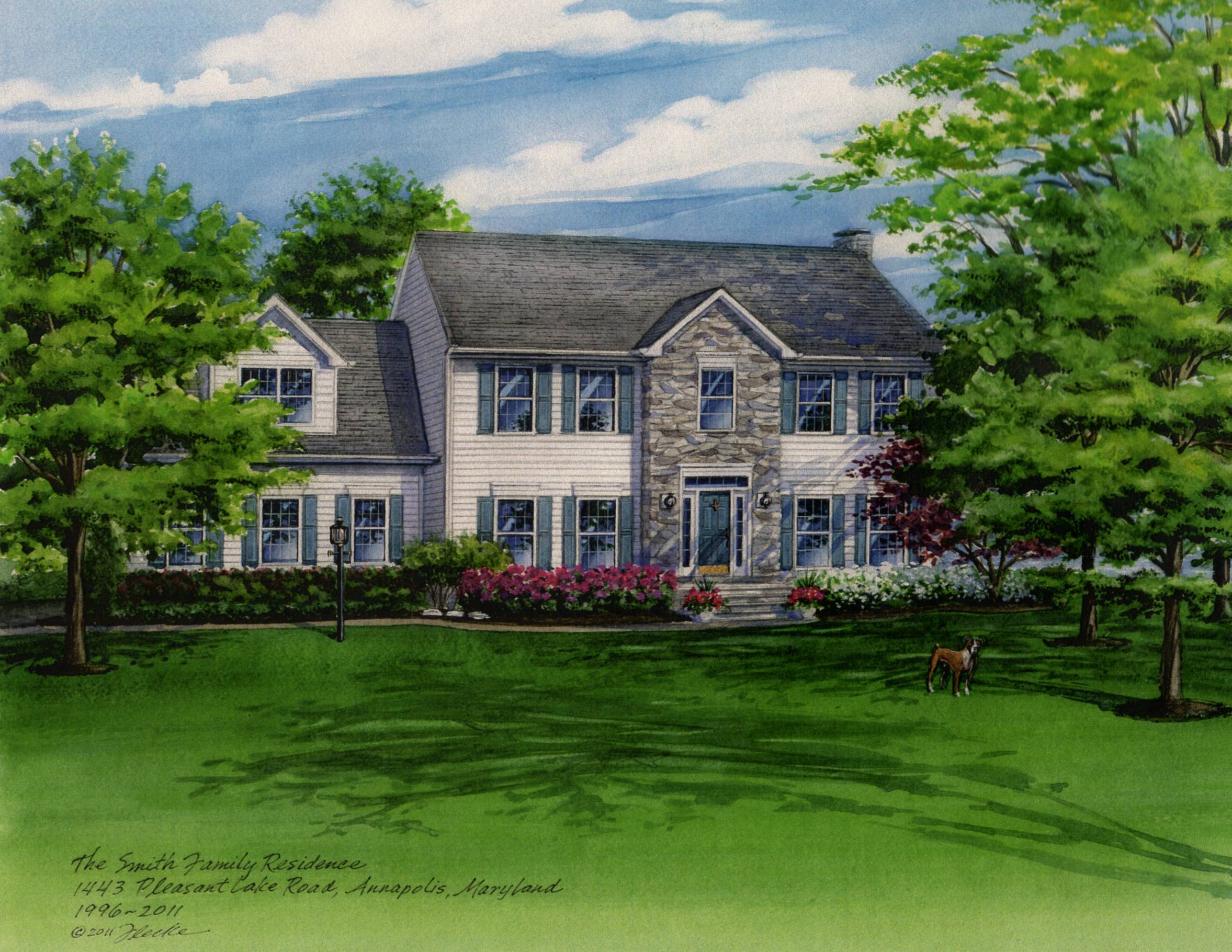 Just completed on October 14th. this 16″x 20″ Watercolor portrait of a beautiful stone and frame residence in Annapolis, Maryland. It is situated on a tree-filled large lot near the bay, and complete with the beloved family dog on the front lawn.