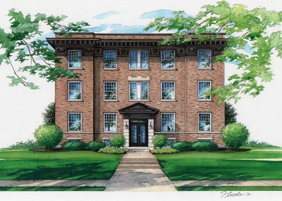 This 11″x 17″ pen and ink with watercolor portrait depicts a six-family condominium property located in University City, Missouri and was so interesting to portray. The decorative cornice with very ornate frieze underneath along with the gorgeous carved pediment above the entry door give so much distinguished character to this building. The artwork was commissioned to be a graduation gift from my client to his fiance and includes their two cats sitting in a window of their unit. I hope she will be pleased with this custom house portrait and wish this young couple many happy memories in this residence!