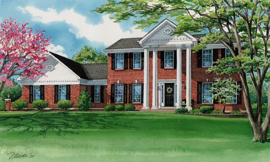 The newest custom house portrait portrays a large, two-story traditional home with timeless classic style located in Weldon Spring, Missouri. The 9″ x 15″ watercolor artwork was commissioned by a thoughtful wife as a birthday gift to her husband and she’s looking forward to framing and presenting it to him — I hope he will be pleased with the portrayal!